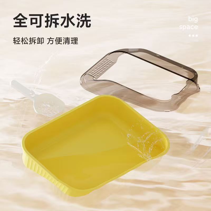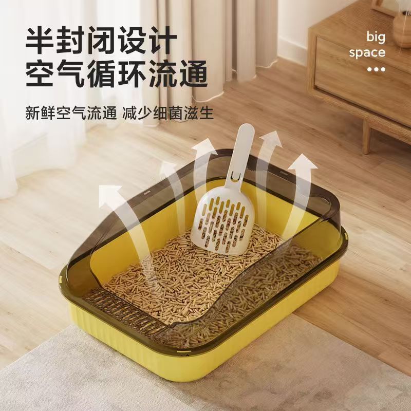The open-top semi-enclosed structure allows fresh air to circulate freely, reducing bacterial growth and unpleasant odors, while the raised transparent rim effectively prevents litter from being kicked out of the box.